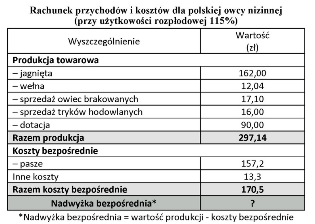 Na podstawie przedstawionego zestawienia przychodów i kosztów oblicz nadwyżkę bezpośrednią z produkcji owczarskiej dla polskiej owcy nizinnej.
