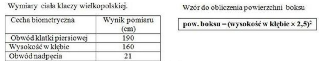 Na podstawie zamieszczonego wzoru oraz podanych wymiarów klaczy oblicz minimalną powierzchnię boksu dla klaczy ze źrebięciem.