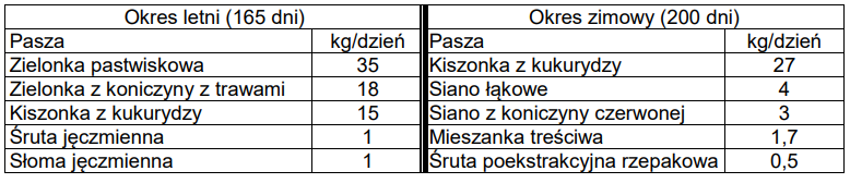 Ile kiszonki z kukurydzy potrzeba rocznie dla stada 20 krów mlecznych żywionych według przedstawionych w tabeli dawek pokarmowych?