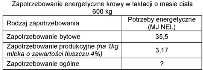 Na podstawie danych zawartych w tabeli oblicz zapotrzebowanie ogólne na energię netto laktacji dla krowy, której dzienna produkcja wynosi 25 kg mleka o zawartości 4% tłuszczu.