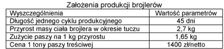 Oblicz koszt paszy (netto) potrzebnej do wyprodukowania 1000 szt. brojlerów kurzych przy podanych założeniach produkcji.