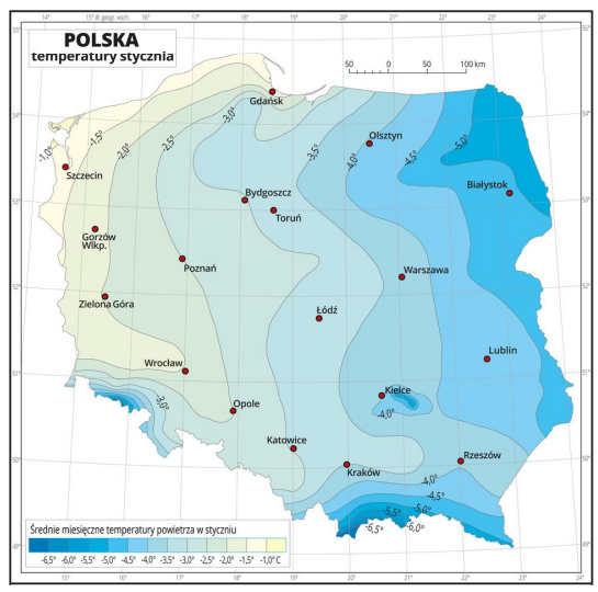Na podstawie mapy temperatur stycznia w Polsce wskaż obszar, gdzie występują najwyższe średnie temperatury w tym czasie.