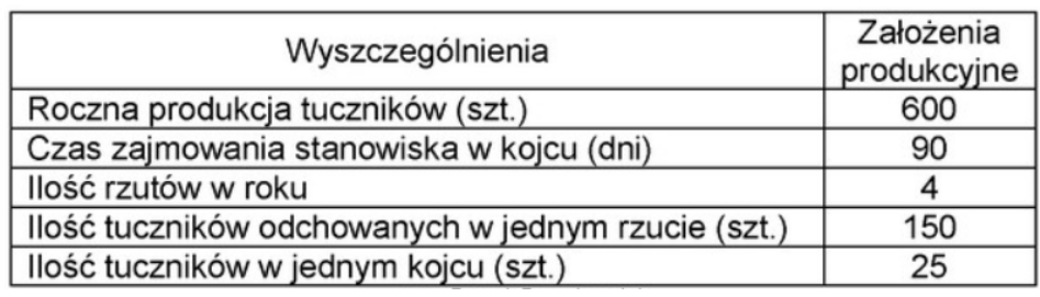 Ile kojców potrzeba do odchowu jednego rzutu tuczników mięsnych w tuczarni prowadzonej według przedstawionych w tabeli założeń produkcyjnych?